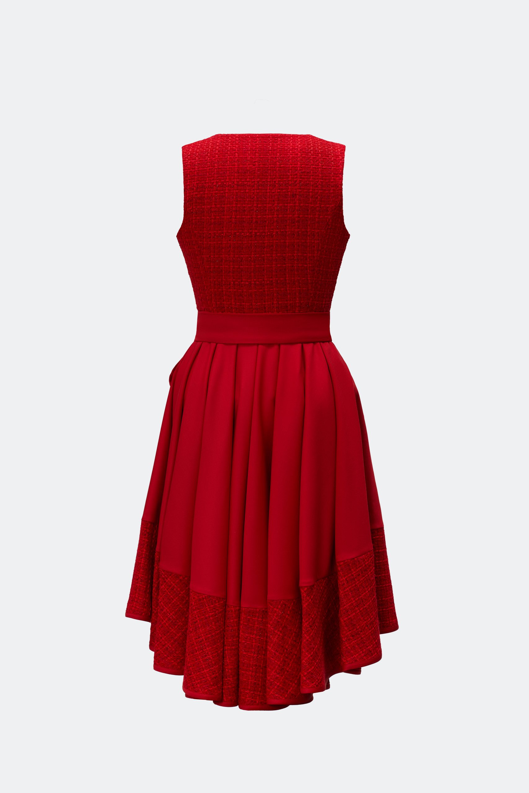 โข Exklusives purpurrotes Designerdirndl mit wunderschรถnem Tweed-Mieder im angesagten Ton-in-Ton Look mit dezentem Herzausschnitt.