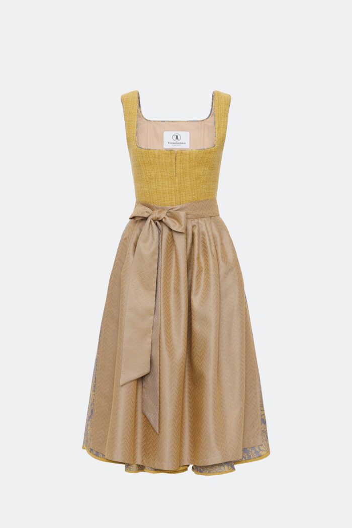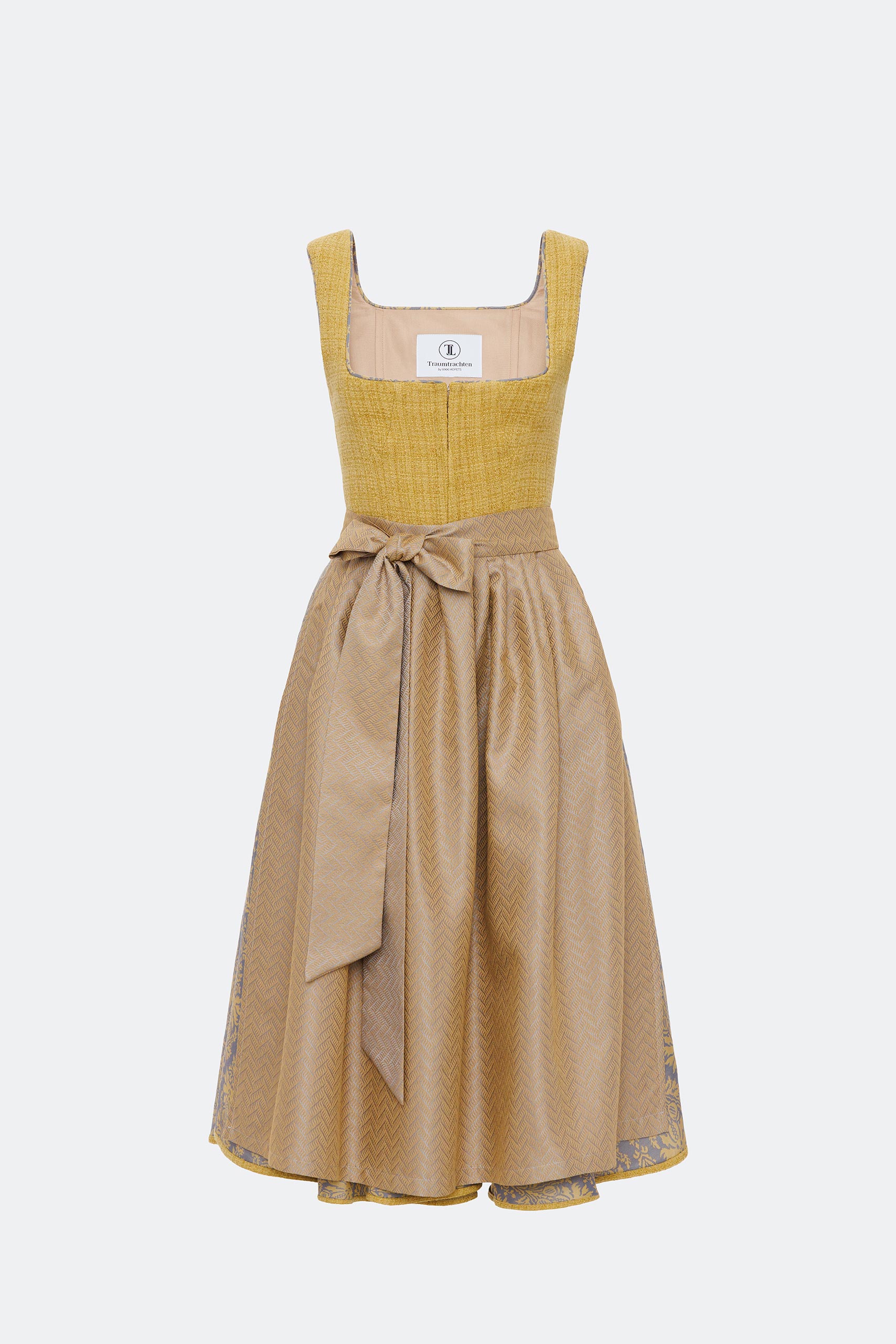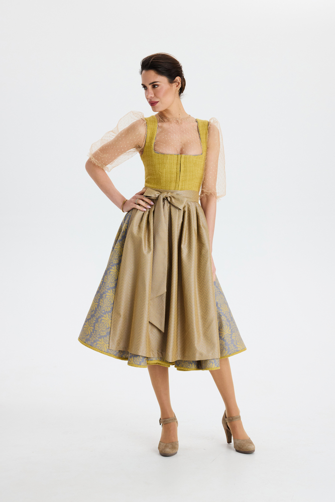 Festliches Dirndl ISABELLA in strahlendem Goldgelb mit ornamental gemustertem Rock.