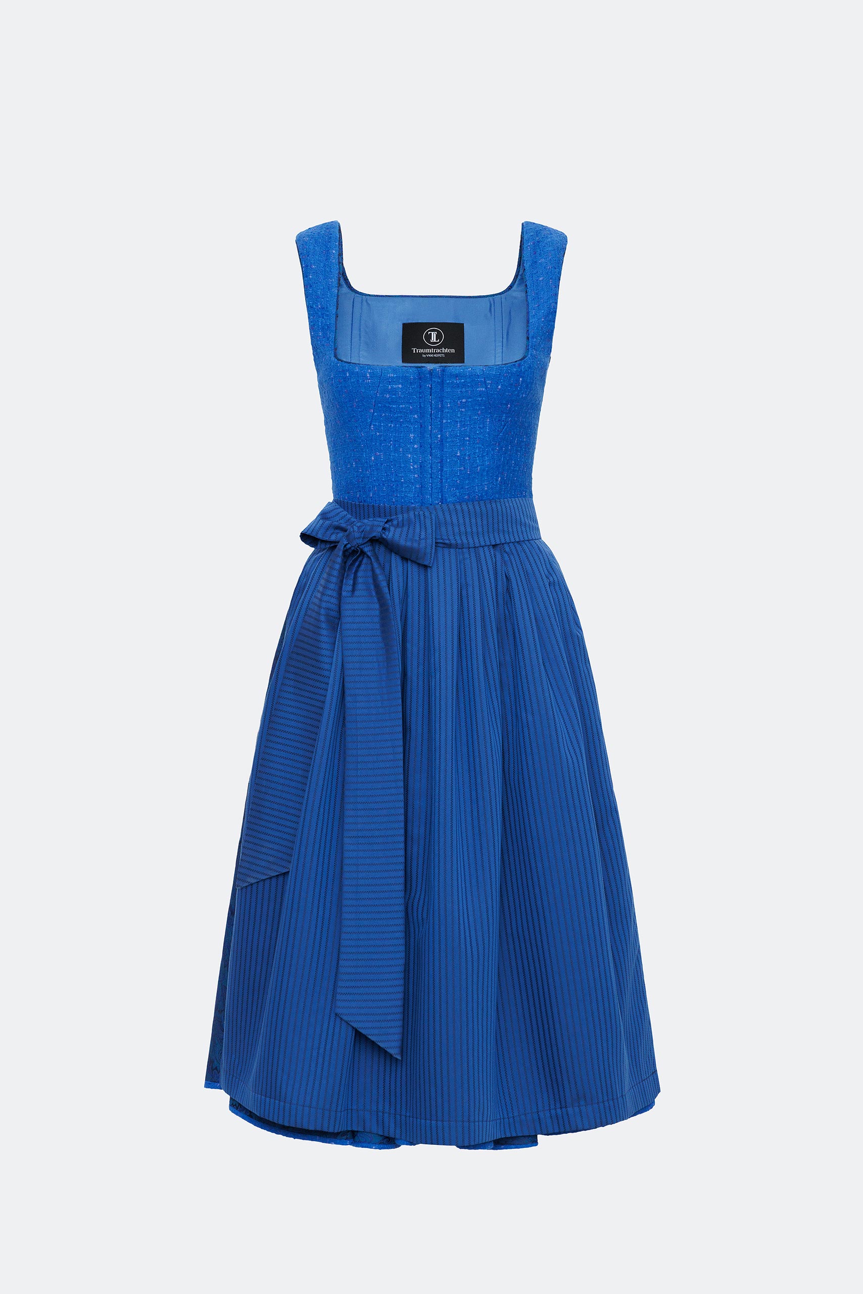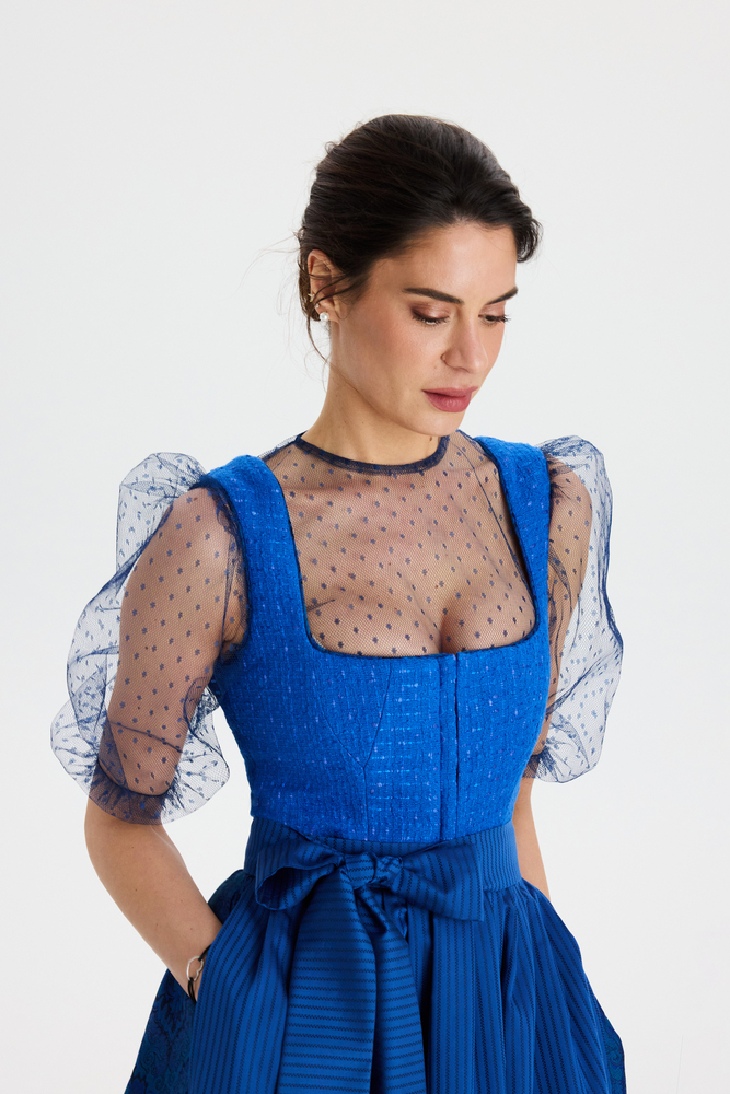 Elegantes Dirndl LIVIA in Meerblau mit fein strukturiertem Mieder und zwei Schรผrzen.