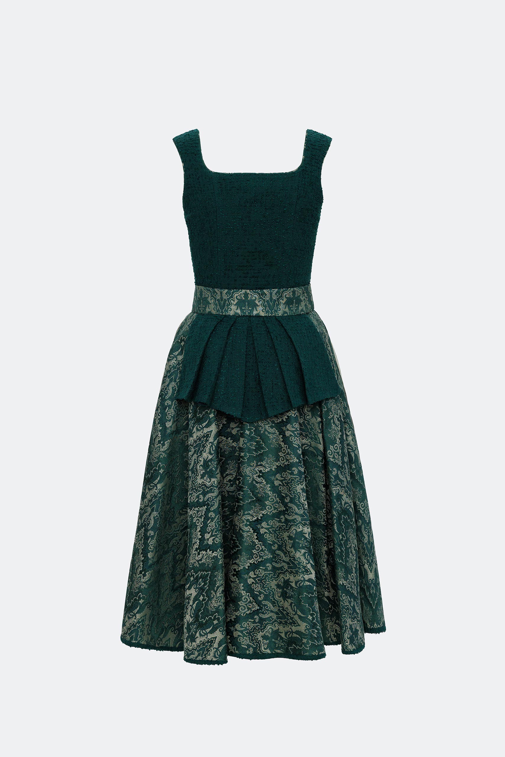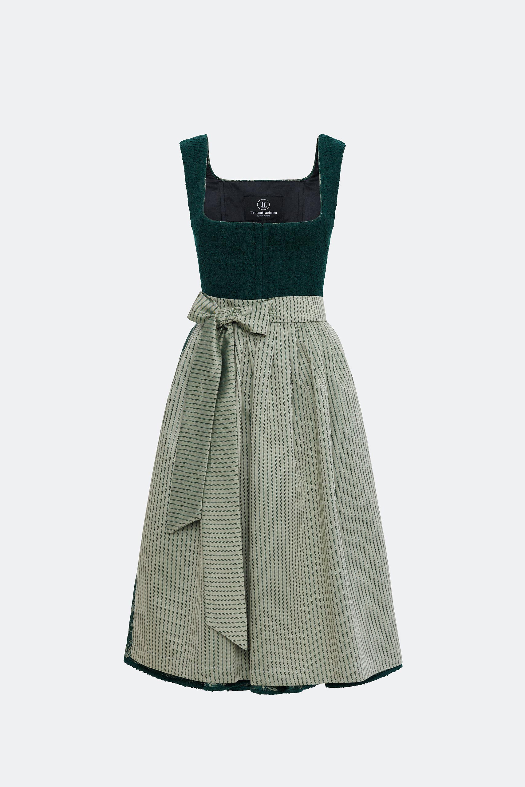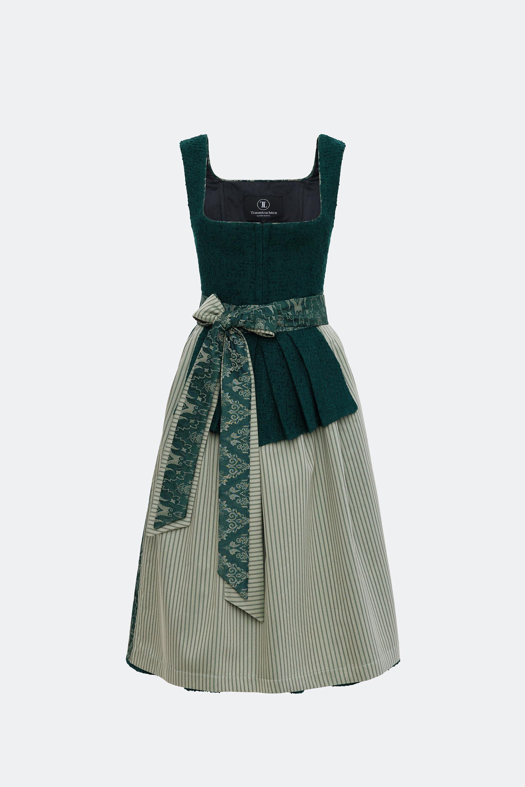 Klar, modern und mit besonderer Tiefe: Das Dirndl LORENA in Grün verbindet ein strukturiertes Mieder mit einem ausdrucksstarken Rock. Der satte Grünton wirkt ruhig und hochwertig, gleichzeitig aber lebendig durch die Kombination der Materialien.