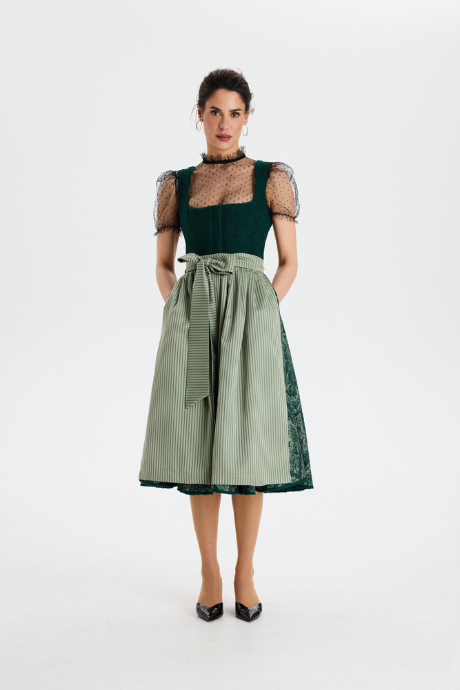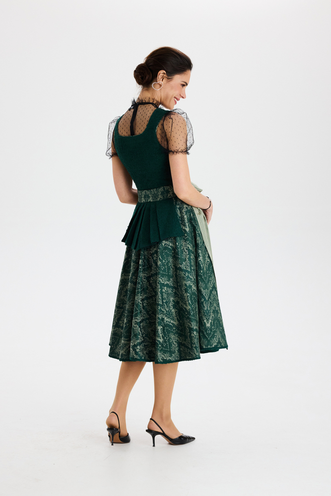 Ausdrucksstarkes Dirndl LORENA in Grün mit floralem Jacquard-Rock und zwei Schürzen.