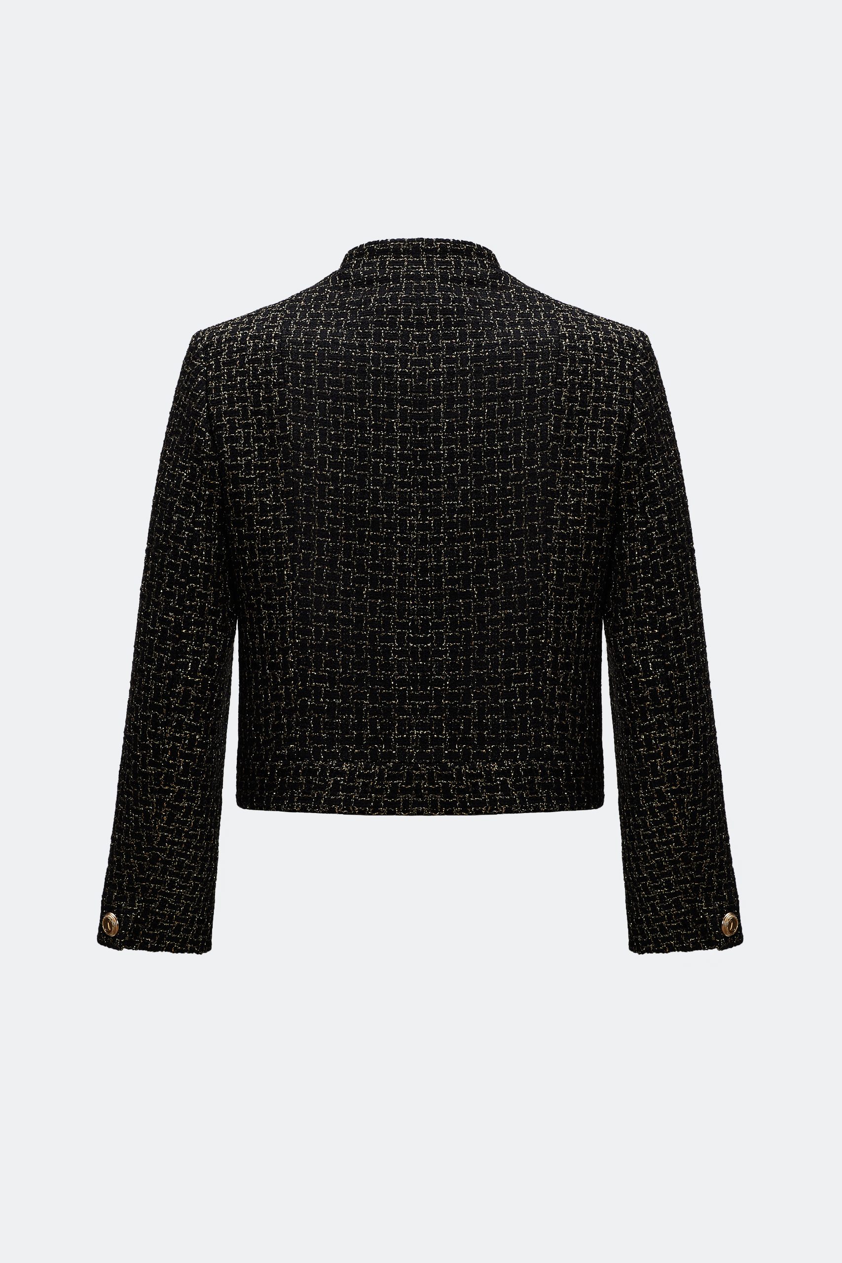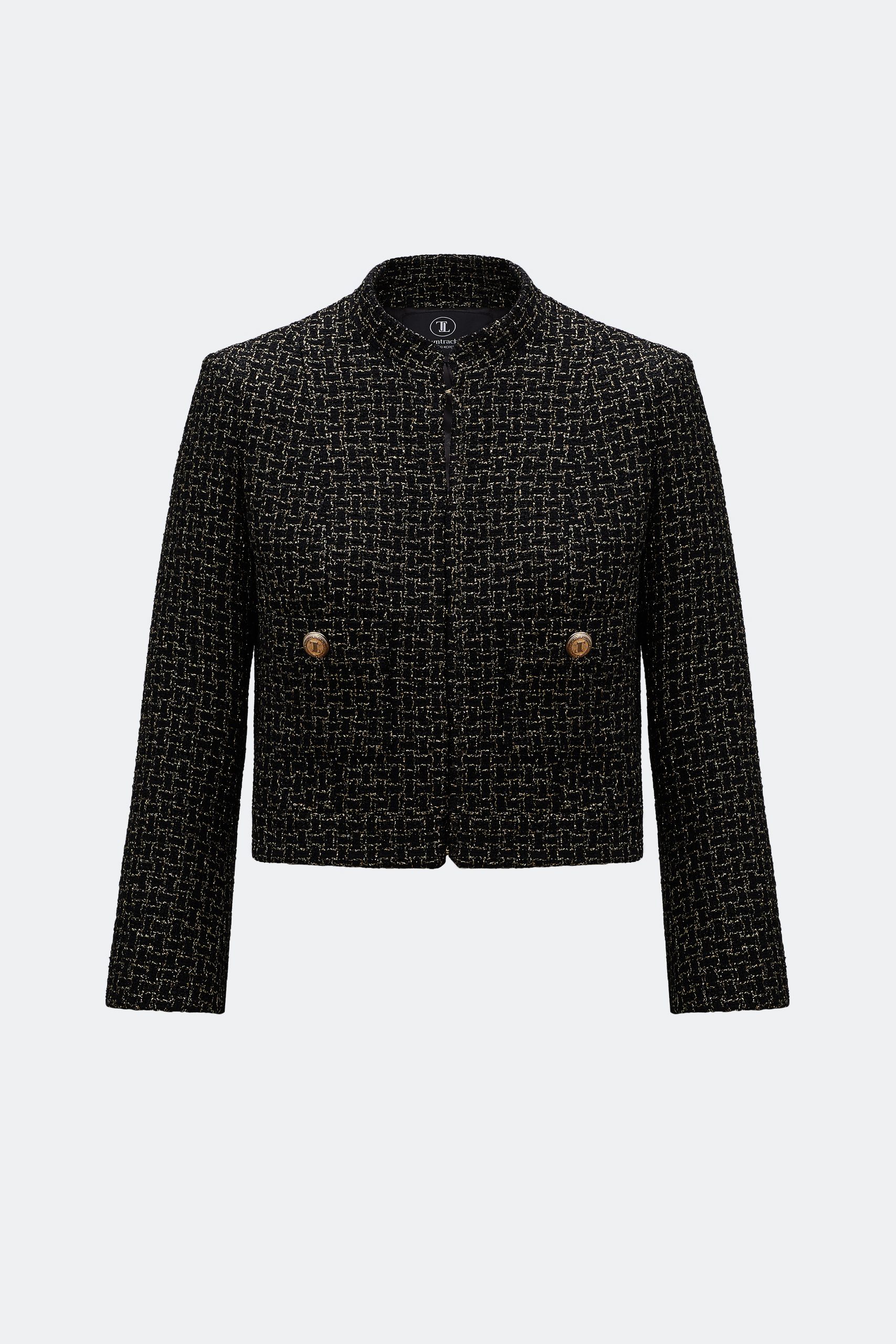 - Janker mit edlem Stehkragen aus feinem schwarzen Tweed mit eingewebten goldfarbenen Pailletten.